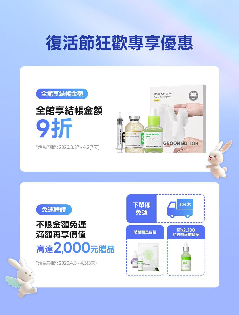 至2026-04-02T18:00:00.000+00:00截止 全店,🐇狂歡復活節:結帳不限金額享9折🎁